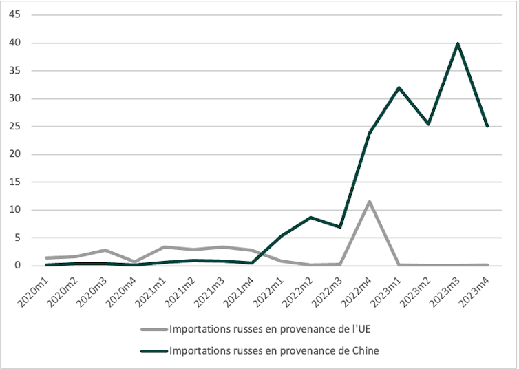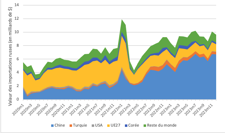 Graphique 2 : Évolution des importations en Russie de produits sanctionnés, par origine. Sources : Calculs des auteurs à partir de Global Trade Tracker et du Journal officiel de l’UE, Fourni par l'auteur
