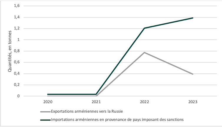 Graphique 5 : Réexportations arméniennes de radios de communication. Calculs des auteurs à partir de Global Trade Tracker, Fourni par l'auteur