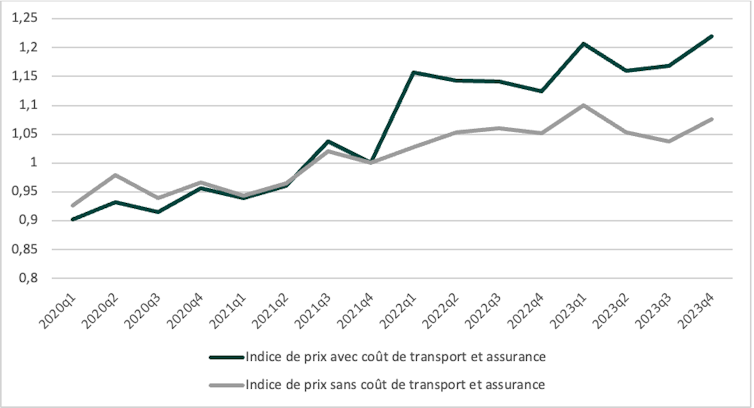 Graphique 4 : Indice de prix des importations russes et coût de transport et d’assurance. Calculs des auteurs à partir de Global Trade Tracker, Fourni par l'auteur