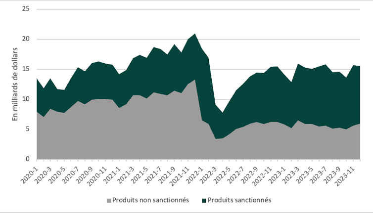 Graphique 1 : Évolution des importations en Russie entre janvier 2020 et novembre 2023, par type de produits. Sources : Calculs des auteurs à partir de Global Trade Tracker et du Journal officiel de l’UE, Fourni par l'auteur