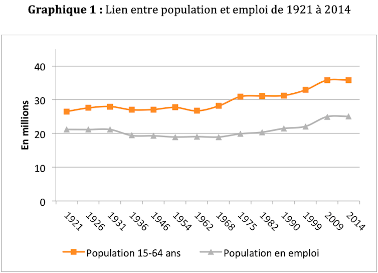 Si l’économie était composée d’un nombre d’emplois fixe, le niveau d’emplois devrait être stable et déconnecté des évolutions de la population en âge de travailler. Or, la population en emploi est passée de 21,2 millions en 1921 à 18,9 millions en 1954 (soit une baisse de 11 %), pour atteindre son plus haut niveau en 2014 à plus de 25 millions (soit une hausse de 30 % par rapport à 1954). En outre, population en emploi et en âge de travailler ont tendance à varier dans le même sens et selon la même ampleur. De quoi infirmer l’idée que le volume d’emplois serait fixe et qu’un accroissement du potentiel de travail dans une économie conduirait nécessairement à une baisse de salaires et/ou à une hausse du chômage.