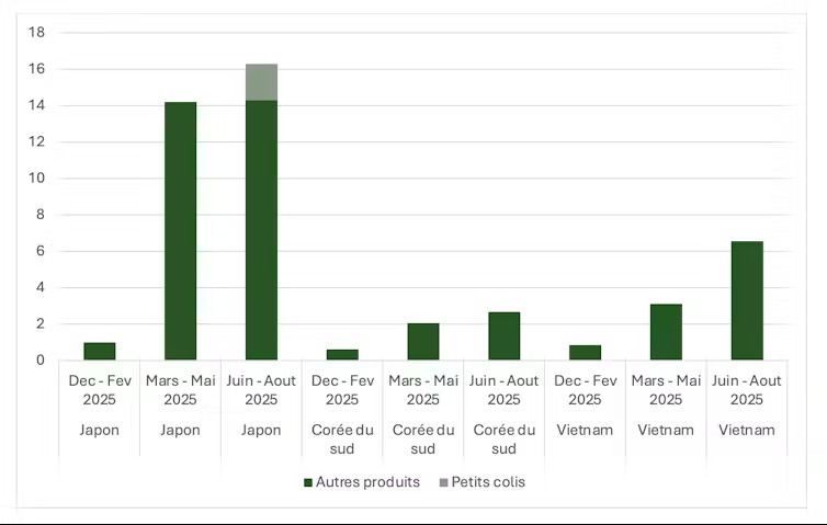 En valeur, les 176 produits identifiés représentent 7,2 % des exportations chinoises vers l’Union européenne sur la dernière période disponible, et la tendance est clairement à la hausse (graphique 3). Cette progression s’explique pour beaucoup par la hausse des flux de petits colis redirigés vers l’UE depuis qu’en avril 2025, les États-Unis ont supprimé l’exemption de droits de douane sur les colis en provenance de Chine.