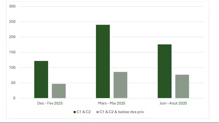 En combinant les deux critères, 176 produits sont concernés en juin-août 2025 (graphique 2), soit 44 % des produits dont les ventes ont nettement chuté sur le marché états-unien. Parmi eux, 105 concernent des produits pour lesquels l’Union européenne a un avantage comparatif révélé, c’est-à-dire pour lesquels la hausse des importations se fait sur une spécialisation européenne.