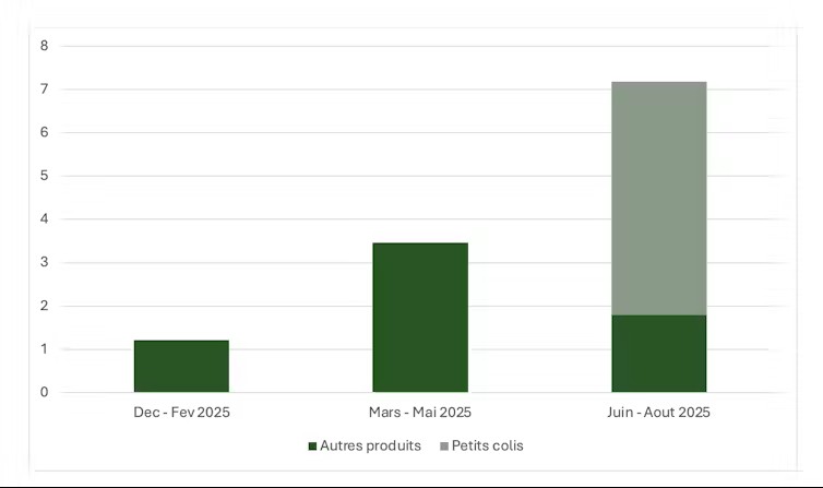 À la suite des droits de douane mis en place par Donald Trump, on observe une réorientation significative du commerce chinois des États-Unis vers l’Union européenne à travers les… petits colis. Explication en chiffres et en graphiques.