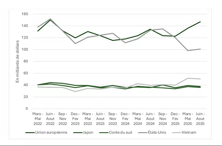 Le premier graphique montre que, depuis février, la baisse des exportations chinoises s’est accompagnée d’une hausse de celles vers l’Union européenne. Une analyse des évolutions passées révèle toutefois que la hausse observée au deuxième trimestre 2025 correspond en partie à un rebond saisonnier observé à la même époque les années précédentes et lié au Nouvel An chinois, que cela soit pour l’Union européenne, les États-Unis, le Vietnam, le Japon ou la Corée du Sud. Il est essentiel d’interpréter les évolutions récentes au regard des dynamiques saisonnières des années antérieures.
